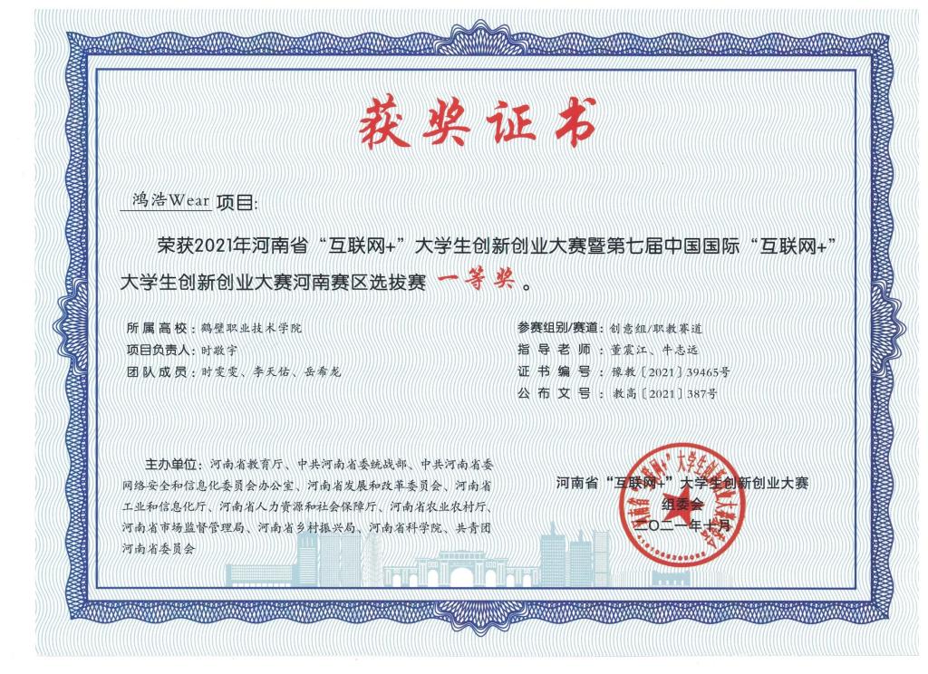 鸿浩Wear项目荣获2021年河南省“互联网+”老员工创新创业大赛河南赛区选拔赛一等奖。